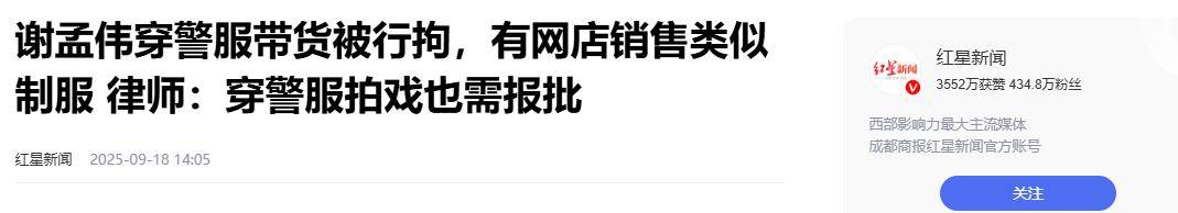 红星新闻:谢孟伟穿警服带货被行拘,有网店销售类似制服 律师:穿警服拍戏也需报批