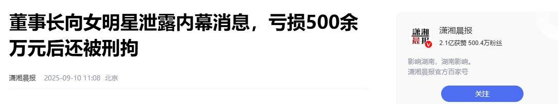 潇湘晨报:董事长向女明星泄露内幕消息,亏损500余万元后还被刑拘返回搜狐,查看更多